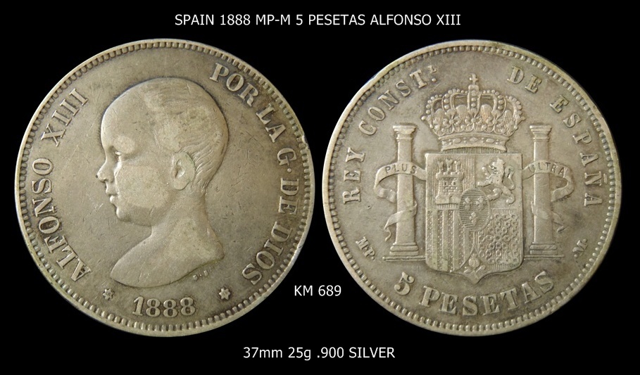 Another coin that jumped out at me was this Spanish Crown of Alfonso XIII. I used to have a Philippine crown of his depicting him in his teen years. This crown depicts him as a toddler. He became King of Spain upon his birth as his father Alfonso XII had died before his birth. The price was well below catalog so I couldn't pass it up. SP  1888 Alfonso XIII 5 pesetas.jpg