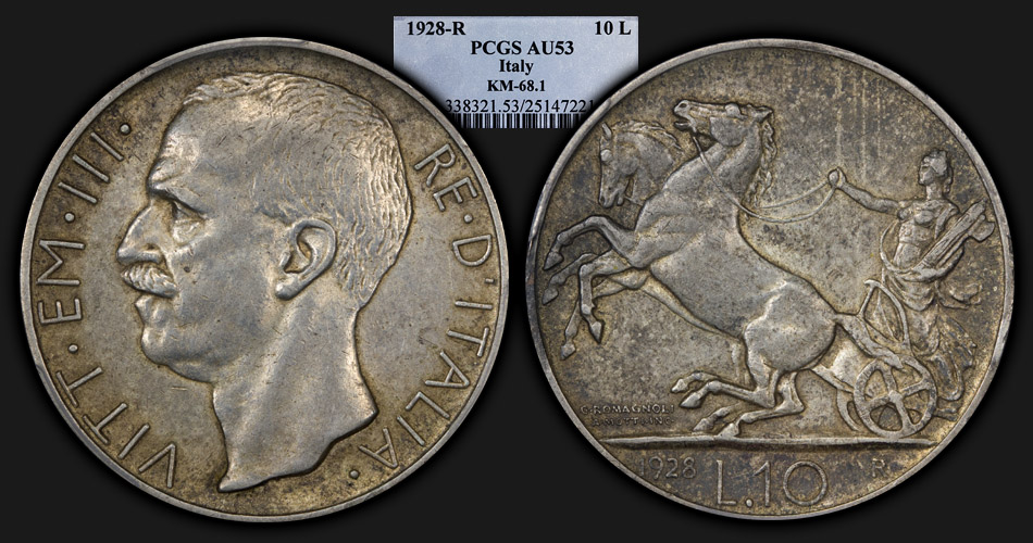 This new addition to my horse themed set arrived today. It is a nice crusty version of a somewhat difficult Italian type coin. Finding one in AU range is doable and affordable with patience -- but finding the type in MS is almost impossible, and often very expensive. I opted for AU range. The design of the woman riding in the biga is great! Krause lists the mintage of the 1928 at 6.6 million pieces and gives values of $60 in VF, $200 in XF, and $400 in MS. No AU price is given, but this AU example with a lot of "crust" set me back around $80. The 1928 is a slightly better date than the much more common 1927, which was minted in a quantity of 44.8 million with listed prices of $30 in VF, $100 in XF, and $200 in MS. The other available dates (1926, 1929, and 1930) go for more money and are difficult to even hunt down in grades of AU, let alone MS. To complicate matters, the 1927, 1928, and 1929 issues come in two different edge lettering types (the KM# 68.1 as mine is, and the KM# 68.2 which varies slightly). Follow the two links if you wish.