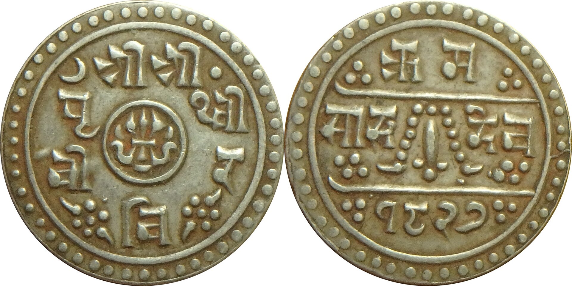 That is a 1905 Nepal AR 1/2 mohar. Here is a link with more details: https://en.numista.com/catalogue/pieces33022.html