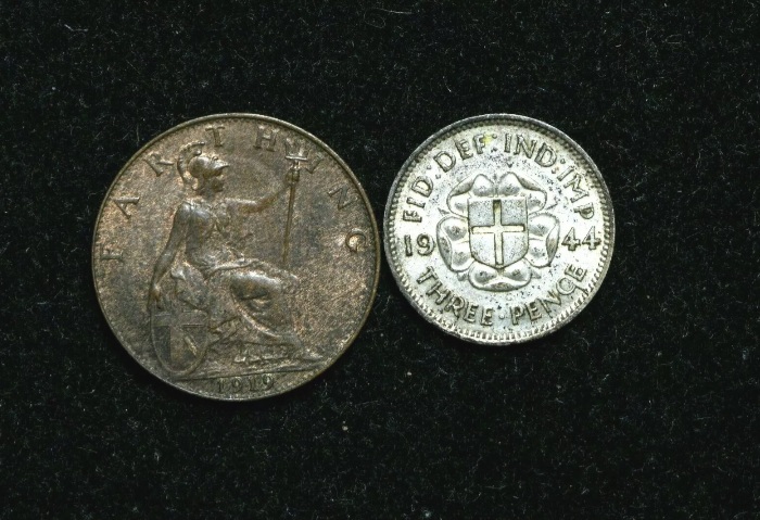 The 1919 farthing is pretty common, even in that condition. The 1944 silver threepence is much scarcer as it was the last year released for circulation and then only in the colonies. If you got the both for $4 you did very well! There is a 1945 silver threepence - they made about 150000 but then decided not to issue them and all but a handful were melted down. One came up at auction recently and made more than £50k.
