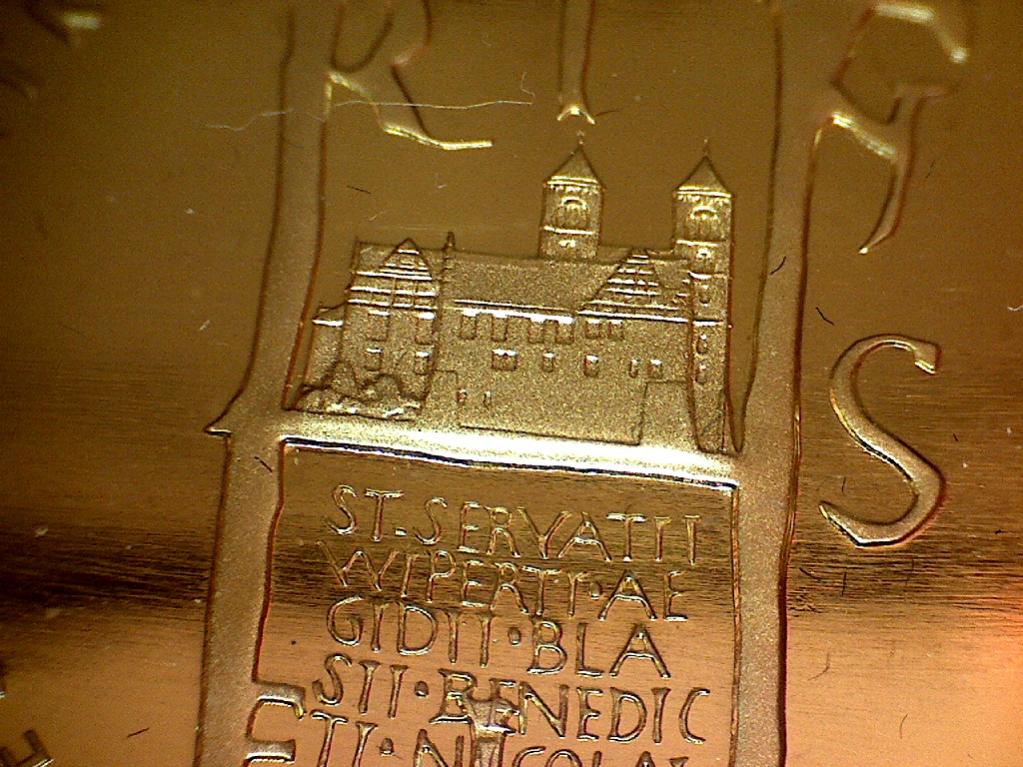 Most designs of the 100€ coin series are drawn to mathematical precision and lack the charm of a hand drawn design, the Qedlinburg is an exception to this. The design is from Agatha Kill, in 2003 the price set for the coin was 190€, the coin has a diameter of 28mm (same as the Austrian Gold Philharmonic, I believe it's even the same planchet) and is minted in an half ounce of fine gold with a mintage number of 400 000. The 100€ gold coins are popular among German bullion stackers. This coin marks the first in the UNESCO world heritage series and the second 100€ Gold coin of Germany, the first one being the Euro monetary union commemorative. Here the same coin with the church in greater detail: