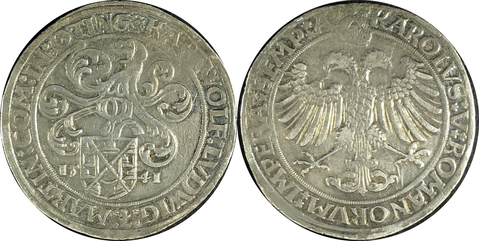 This one came in the mail today from Karl Stephens. The photos don't show how much luster it still has in the legends. 1541 Öttingen Thaler. It's my first Thaler from here and also one of my earlies Thalers. I see it spelled both Öttingen and Öettingen, depending on where you look. Does anyone know the correct spelling? Or, is it one of those things, are they both correct. Obverse: Shield of Öttingen arms divides date, ornate helmet with dog's head crest, titles of 3 counts Reverse: Crowned imperial eagle, titles of Karl V begin KAROLVS Ruler: Karl Wolfgang, Ludwig XV and Martin Note: Dav. #9617. Composition: Silver Weight: 28.9 Diameter: 40.3
