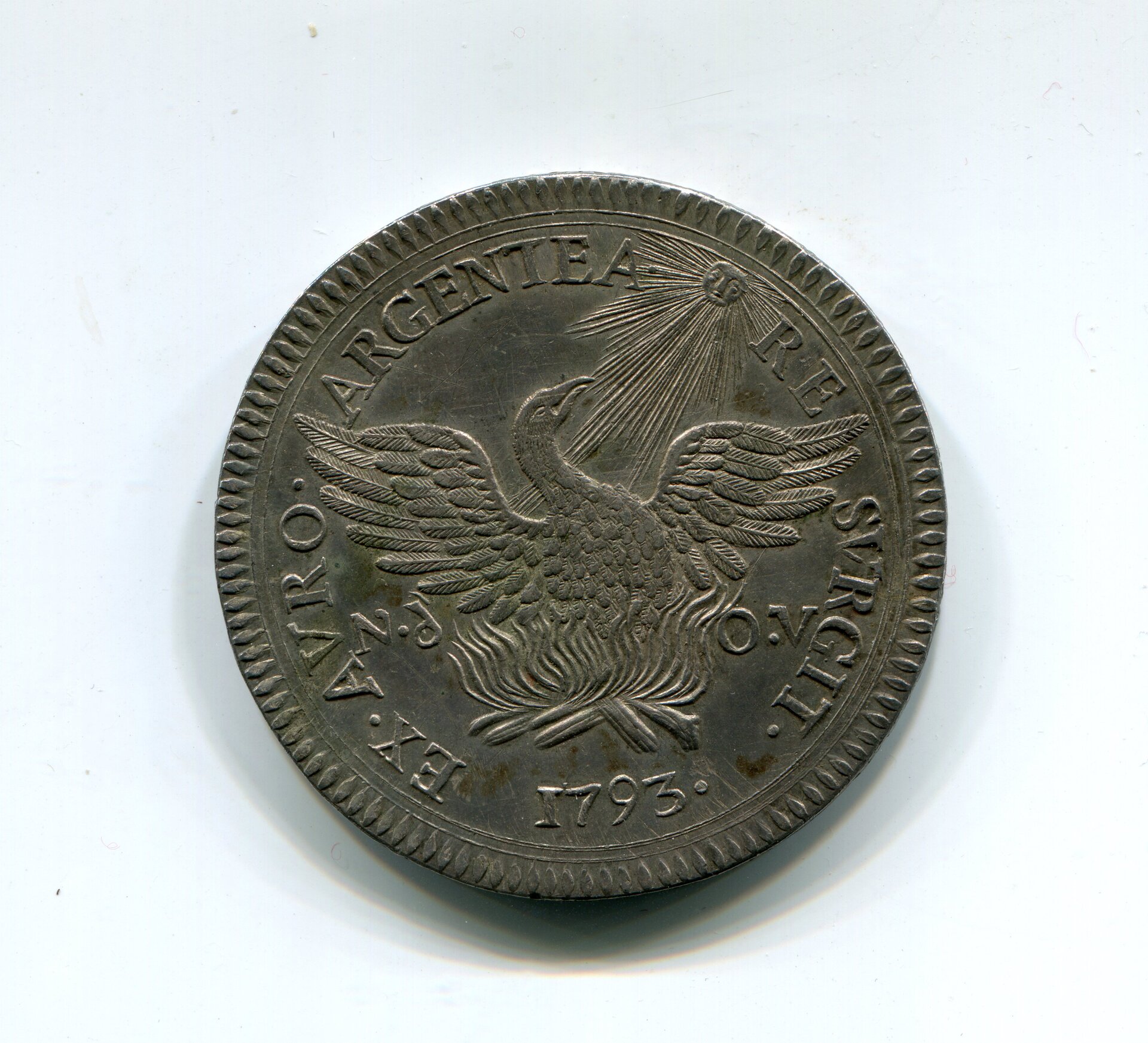 Italy SICILY Ferdinando III (IV of Naples) Oncia of 30 Tari Rev.: EX.AVRO._ ARGENTEA._ RE_ SVRGIT ( from gold it arises again, made of silver). Sun shining down on phoenix rising from flames, dividing N.d O.V (= Nicole d'Orgemont Vigevi, Barone de la Fontaine, mm 1793-98) This presentation coin consists of 1 ounce of silver. It weighs 68.2 g with a diameter of 48 mm. The reverse motto ex auro argentea resurgit refers to the very peculiar nature of this coin. The gigantic silver piece was the rebirth of an older traditional Sicilian one ounce coin, which had been minted for centuries in gold (4.4 grams). It is therefore the rebirth and transmutation of gold into silver at a 1 to 15.5 ratio which was being celebrated !