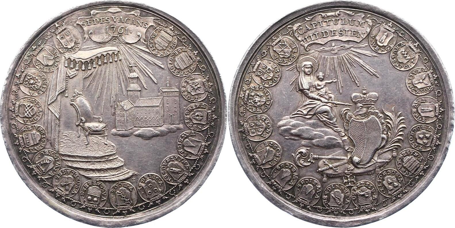 Reverse: On a three-tiered dais with a canopy stands the bishop's chair, which is covered with the miter, in the background r. the Hildesheim Cathedral, above the divine eye of providence in rays, around heraldic wreath