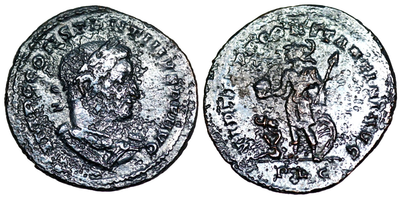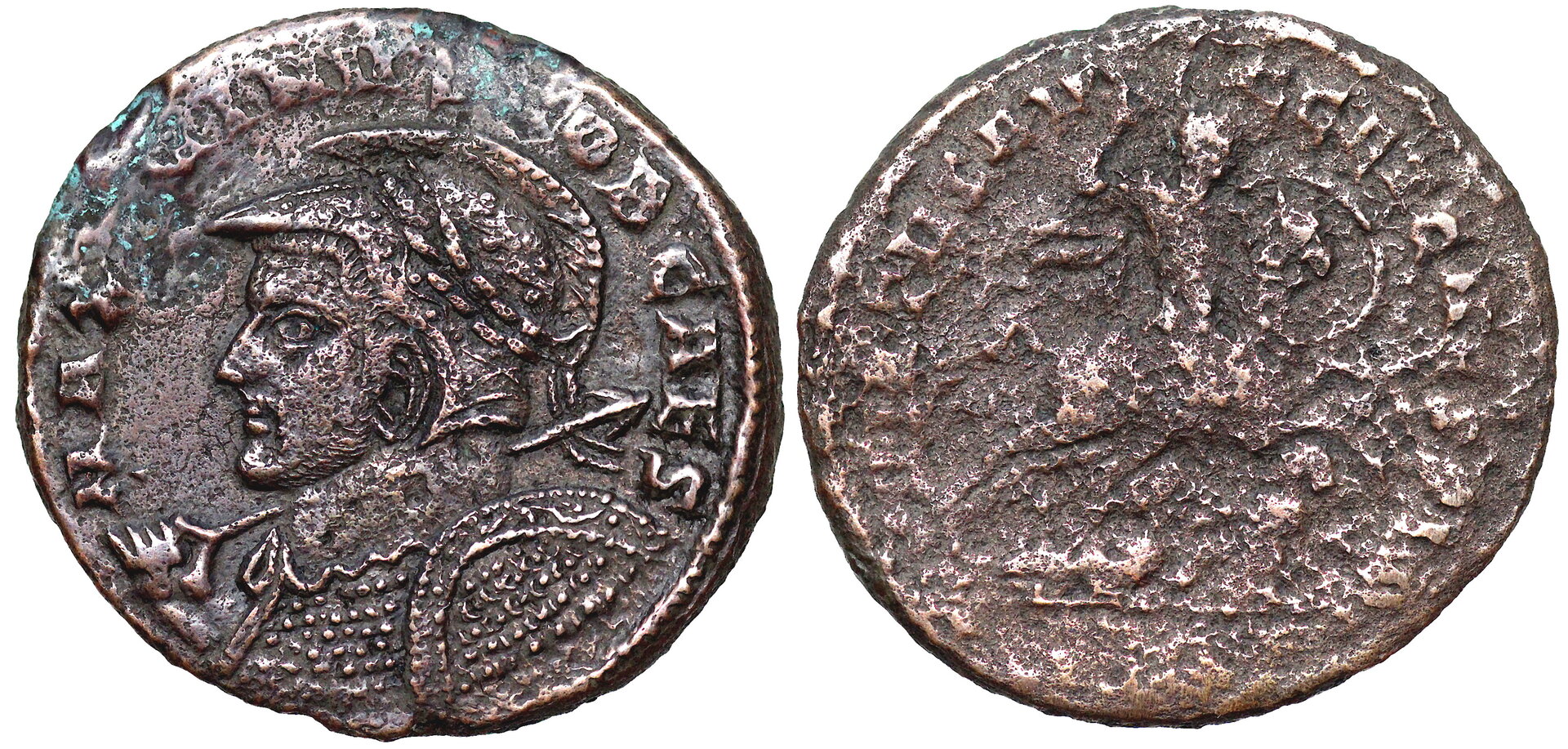 this is the worst coin in my VLPP collection; but since it has a hippocamp on the shield, it's a keeper. Constantine I A.D. 318-19 18mm 2.4gm IMP CONSTANT-INVS AVG; high crested helmet, cuir., spear across r. shoulder, shield on left arm inscribed with hippocamp. VICTORIAE LAETAE PRINC PERP; two Victories stg., facing one another, together holding wreath [shield] inscribed VOT PR on altar. in ex. BSIS RIC VII Siscia 56