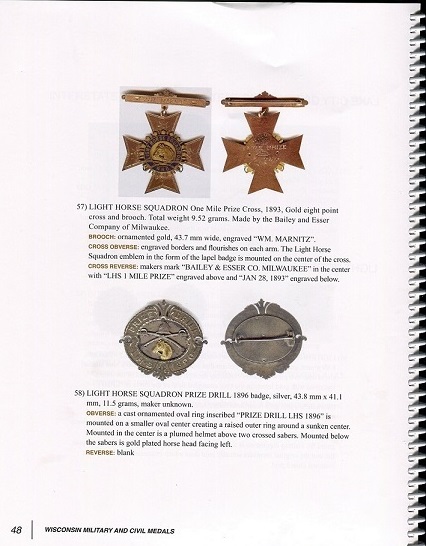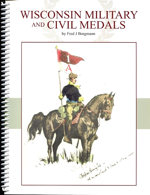 WISCONSIN MILITARY AND CIVIL MEDALS by Fred J. Borgmann This new book is superior to any state and local medals book ever published with 174 full color 8x11 pages printed on 70# digital white paper. A coil binding making this book both user friendly and durable. Over 300 listings of which well over 200 are fully illustrated. Listings include physical descriptions with color scans of the front and back. Historical footnotes and photos are also included where appropriate. There are many rare and unique medals listed in this book. The cover design features a colorized copy of a rare and virtually unknown Fredric Remington drawing which was presented to the Milwaukee Light Horse Squadron by Remington on their twentieth anniversary in 1899. The listings include more than just the medals earned by veterans. To prevent future misattributions both accidental and intentional souvenir medals are included that were sold to the public to fund celebrations and a monument plus some fobs and badges that were sold at the summer camps of old. Reproductions are listed in the hope that this information will save collectors more than a few dollars. There are also some very rare and interesting civilian medals in addition to a section of presentation badges. The new order of this catalog begins with the general issues of the Wisconsin National Guard proper, then issues of the individual units. Next a listing of some interesting and unusual medals that have been un-cataloged until now. An extensive listing of state and local medals issued for war service. To transition from the military to the civilian sections there is a listing of the University of Wisconsin Corps of Cadets (R.O.T.C.) issues and an extensive alphabetical listing of medals from the St. John’s Military Academy. This book is only $35.00 plus $5 for postage by U. S. Postal Service Media Mail. This is not a price guide ! PayPal ok. FRED J. BORGMANN, PO BOX 135, IOLA, WI 54945