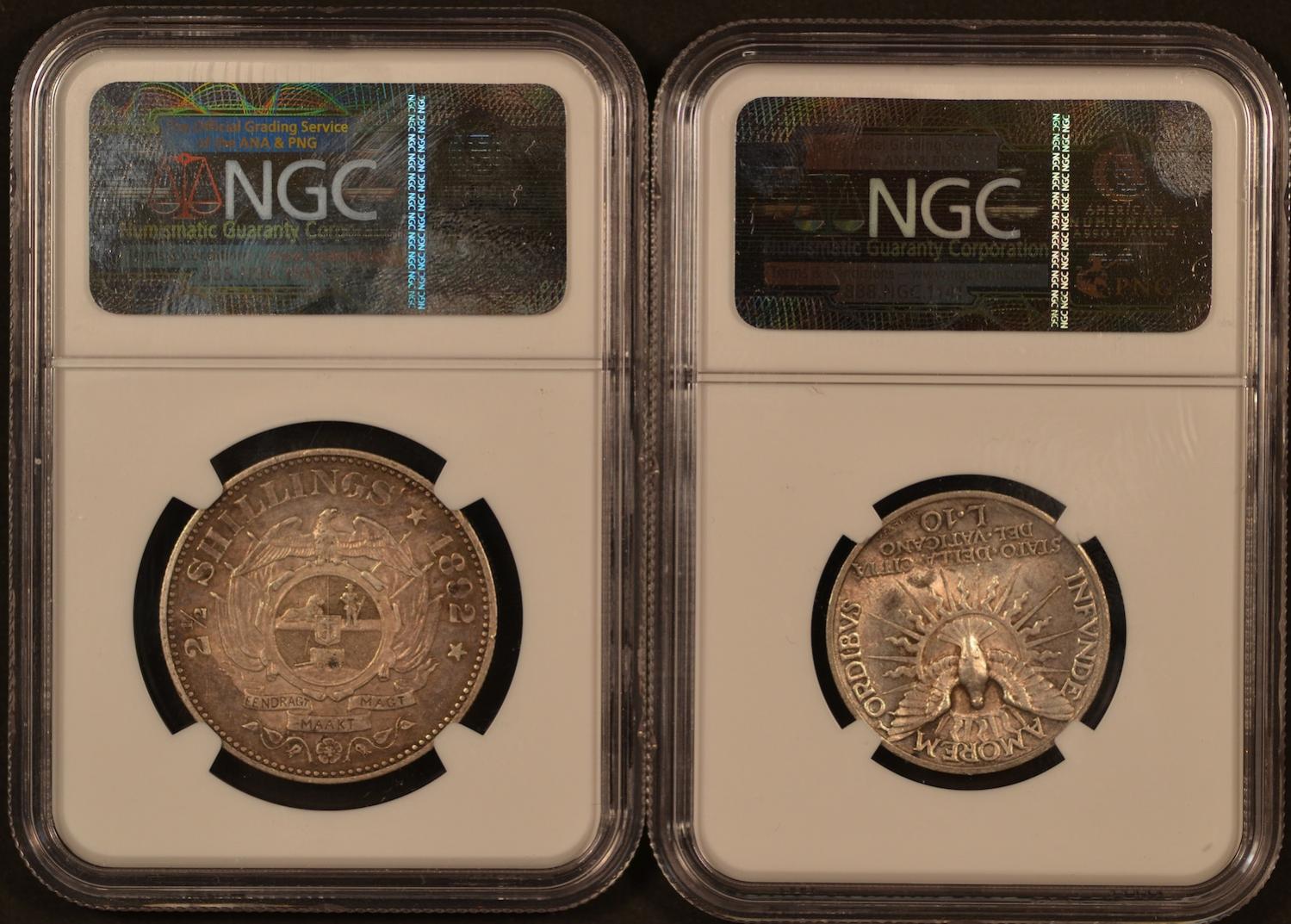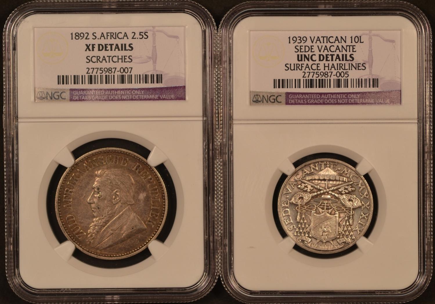 Hello all! I have two interesting coins for trade (or sale, if it comes up.) First coin is a 1939 Vatican City (Sede Vacante) 10 Lire graded by NGC as UNC Details (surface hairlines.) This coin has a super-low mintage of only 30,000 coins. It's 83.5% silver (.2684 oz ASW) Krause lists the values of this coin as follows: VF: $25 XF: $40 UNC: $55 Second coin is an 1892 South Africa 2 1/2 Shillings graded by NGC as XF Details (scratches.) This coin has an EVEN LOWER mintage of just 16,000 coins. It's sterling (92.5% silver (.4204 oz ASW) and I thought deserved better than the grade it got. Krause lists the values of this coin as follows: VF: $40 XF: $135 I'm open to interesting trades or cash offers. I'm always looking for the following coins: 1945 S Micro S Mercury Dimes 1937 S Washington Quarters 1955 D Washington Quarters 1913 Barber Quarters 1927 S Standing Liberty Quarters 1927 D Standing Liberty Quarters 1997 P Matte Proof Jefferson Nickels 1994 P Matte Proof Jefferson Nickels 1998 S Matte Proof Kennedy Halves OR I'm willing to put them toward a 1921 D Walking Liberty Half (or 1914 D Lincoln Cent!) Thanks!