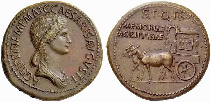 Here is a beautiful sestertius of Agrippina (not mine!) issued under Caligula bearing her portrait and a carpentum - SPQR MEMORIAE AGRIPPINAE.