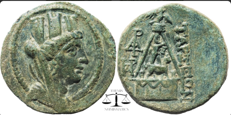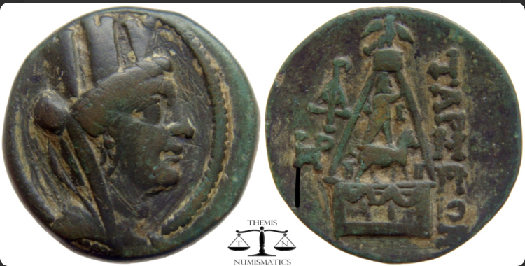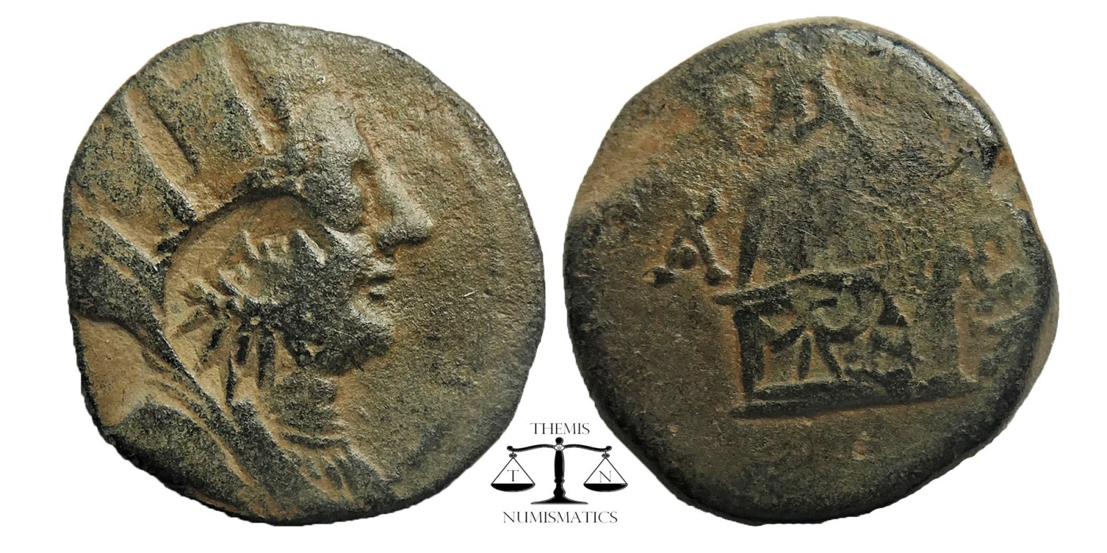 Head of Tyche right (another seller added a few words: Turreted, veiled and draped bust of Tyche right; c/m: radiate head of Helios right within circular incuse)