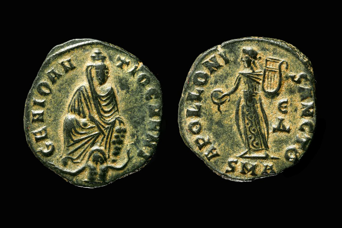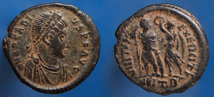 Gratian (367- 383 A.D.) Æ 21 O: D N GRATIA-NVS P F AVG, Pearl-diademed, draped and cuirassed bust right. R: VIRTVS ROMANORVM, Roma seated facing, head left, holding globe and spear,Θ and Φ at sides, anta in ex. theta and phi officina Antioch Mint 2.5g