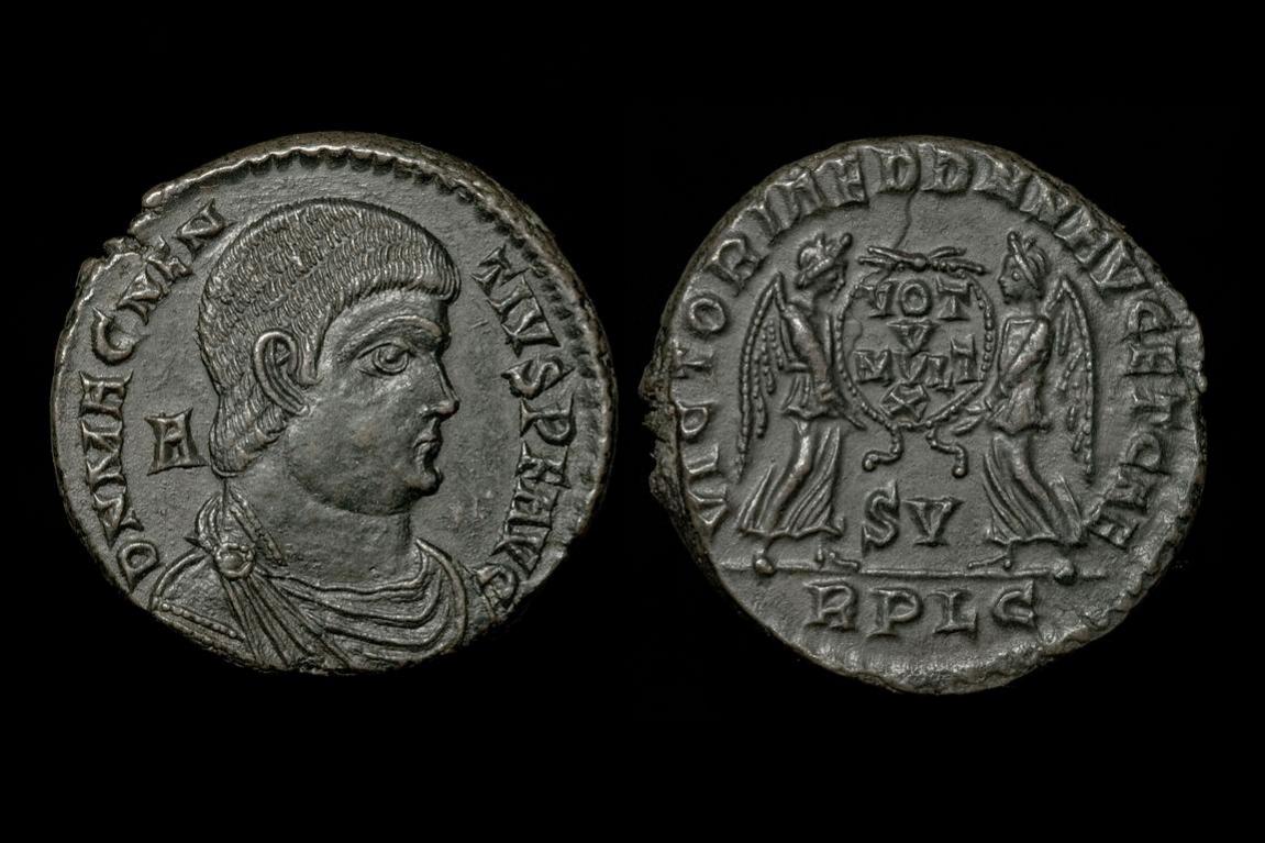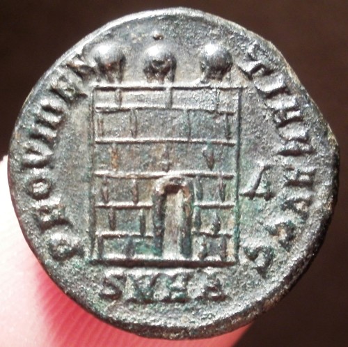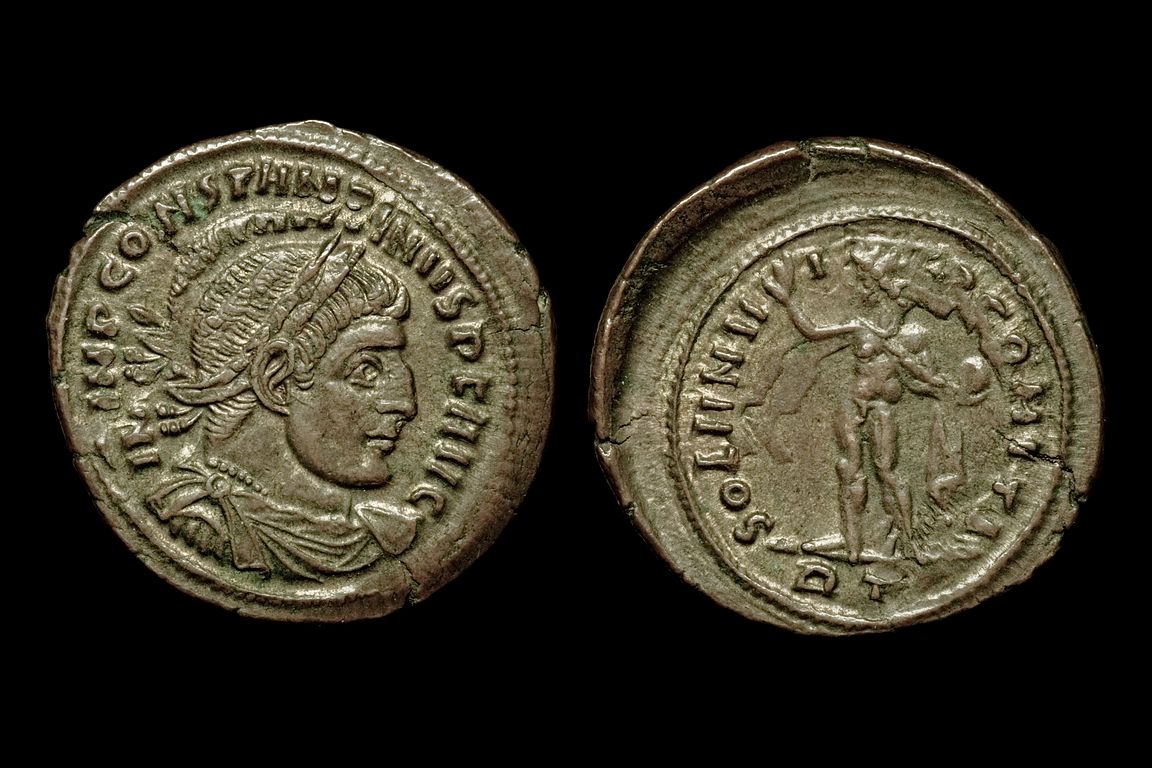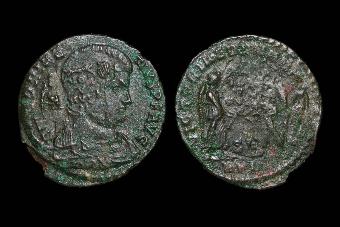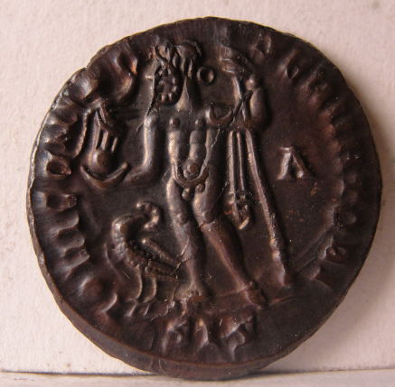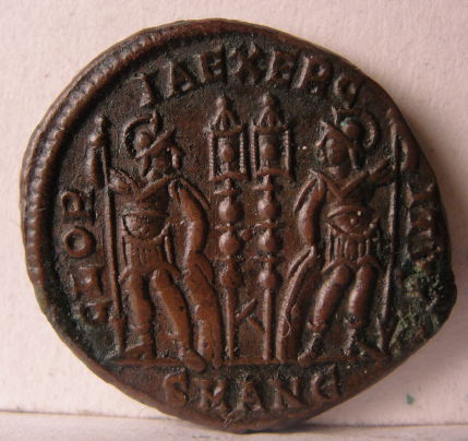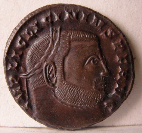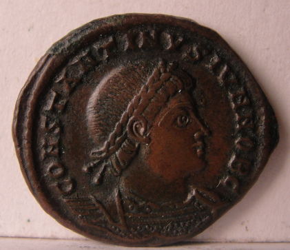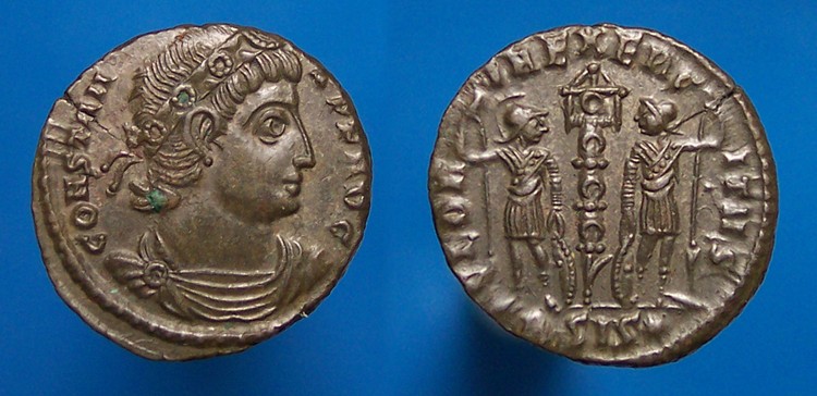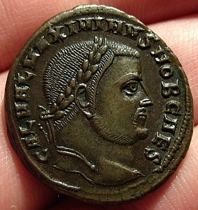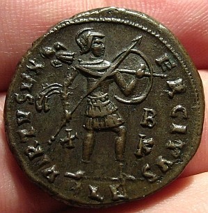 LRB => Hopefully this is "late enough" ... Maximinus II AE Follis Date: 308 AD Diameter: 24.3 mm Weight: 8.2 grams Obverse: GAL VAL MAXIMINVS NOB CAES - Laureate bust of Maximinus II Reverse: VIRTVS EXERCITVS - Mars in military dress, holding transverse spear, shield and trophy over shoulder. X in l. field, B/K in right field References: RIC 83