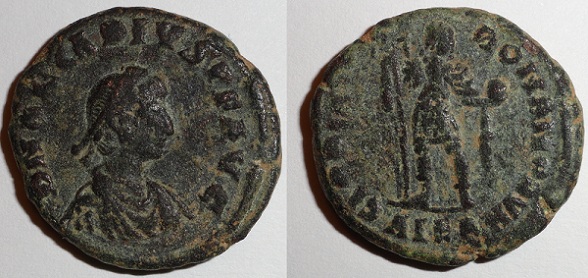 Arcadius and My First Ancient Coin Arcadius AD 383-408 AE 20.9mm x 5.89g Struck.Between 15 May AD 392 and 17 January AD 395 Alexandira, Egypt; Roman Mint Obv: rosette diademed, draped & cuirassed bust right-DN ARCADIVS P F AVG Rev: Emperor standing facing, head right, holding labarum & globe-GLORIA ROMANORVM, ALEA in ex. I don't think its my best condition or my latest Roman but its nice, and nicer to me.