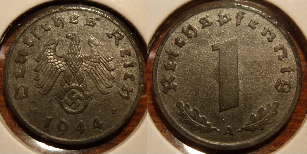 one of the coins i lost (see a couple of posts above) just poped up on this forum (very propably not the same coin, but its a coin like the one i lost) Its a coin from WWII. My grandfather was captured by the Germans during the invasion in Belgium, and he needed to work for them (it was that or get killed,... ) And every time he could he would steel something from the Germans if it was possible (hey, it was war, then you taken what you can get right? ) One of the coins i lost that he gave me was one like CamaroDMD has posted here somewhere on the forum No idea what a coin like that is worth nowdays, but i can imagine if i find out, that i will slap myself So i repeat, dont give coins to a 6year old